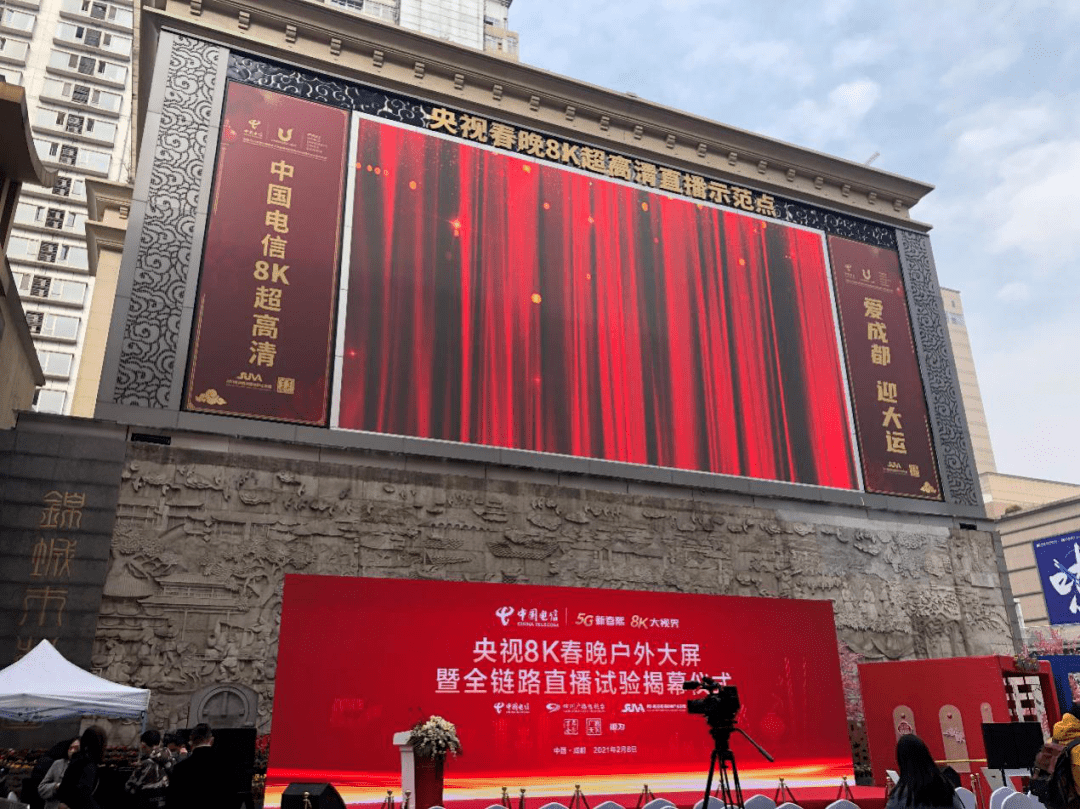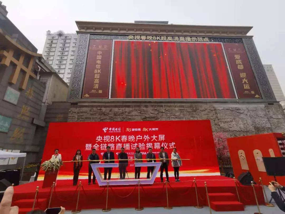 四川电信 “5G新春熙,8K大视界”央视8K春晚户外大屏暨全链路直播试验揭幕仪式在成都举行,省经信厅领导、省广电局领导、成都市委宣传部领导、成都市经信局领导与四川省超高清视频产业联盟及联盟会员企业代表齐聚春熙,共同揭开中西部首块8K户外超高清大屏的神秘面纱。