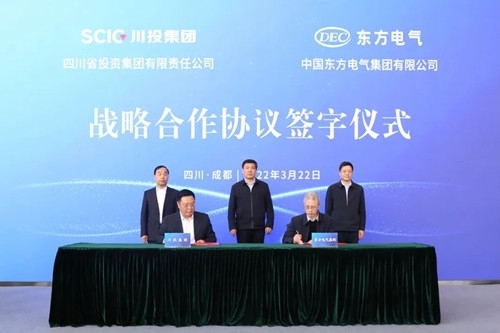 3月22日,中国东方电气集团有限公司与四川省投资集团有限责任公司签署战略合作协议。在四川省人民政府副省长罗强,东方电气集团党组书记、董事长俞培根,川投集团党委书记、董事长刘体斌的共同见证下,东方电气集团总经理、党组副书记徐鹏,川投集团总经理、党委副书记李文志分别代表双方在战略合作协议上签字。