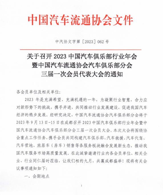 2023年是充满希望、充满机遇的一年,为凝聚行业智慧,合力应对新形势下的挑战,携手并进,共同推动行业发展建设,促进我国汽车经济的稳步发展。经研究决定,中国汽车流通协会汽车俱乐部分会将于2023年9月13日-15日在成都召开2023中国汽车俱乐部行业年会暨中国汽车流通协会汽车俱乐部分会三届一次会员大会。本次大会将围绕协会重点工作任务,携手会员共同构建汽车俱乐部、汽车救援、汽车代驾、汽车营地、旅居车(房车)销售等各服务板块融合发展新生态,推动我国汽车服务市场高质量发展。在此诚挚邀请行业内各会员单位、相关企业、行业同仁届时莅临,让我们相约九月,共襄成都盛举!现将有关会议事项通知如下: